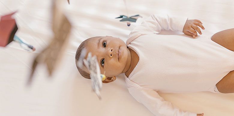 Ce mois-ci, la motricité fine de votre bébé devient plus précise ! Il parvient à tourner la paume de sa main vers le haut ou le bas, mais surtout, la coordination main/œil est bien meilleure : lorsqu’un objet est à sa portée, il parvient désormais à l’attraper. Il le tient fort et l’agite devant lui avec un air satisfait ! Allongé sur le dos, il attrape aussi ses pieds… pour les porter à sa bouche. Ses mains sont de vrais outils pour explorer le monde ! Il comprend aussi progressivement le lien de cause à effet : il répète souvent les mêmes gestes en observant avec attention.