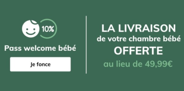 Et pour chouchouter votre budget autant que votre bébé, pensez au Pass Welcome Bébé : 10 % cagnotés à chaque achat jusqu’à ses 1 an, la livraison de votre chambre bébé offerte (au lieu de 49,99 €) et plein d’autres avantages pensés spécialement pour les futurs et jeunes parents. De quoi aménager sa chambre tout en douceur !