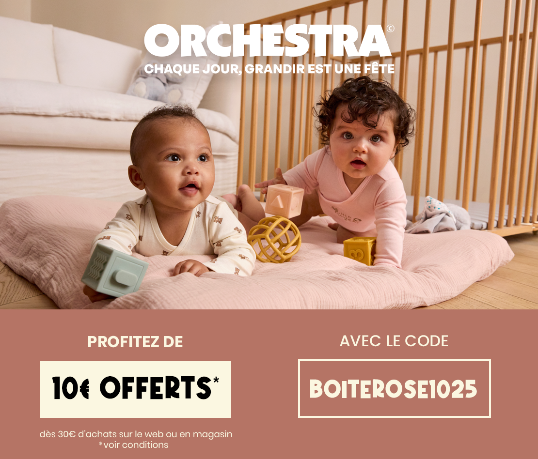 Offre valable en magasin et sur le site orchestra.com avec le code BOITEROSE1025 10€ de réduction immédiate valable pour toute adhésion au Club pour un minimum d’achat de 30€.